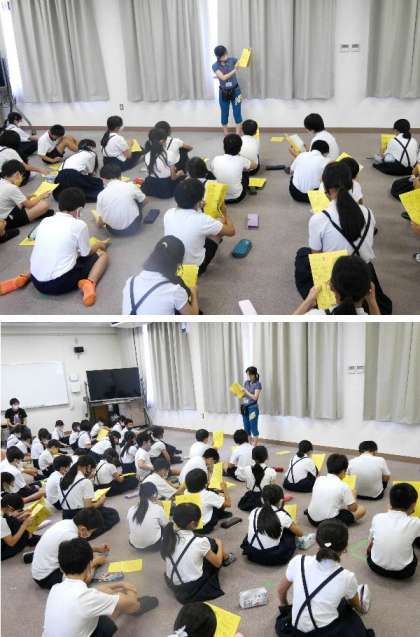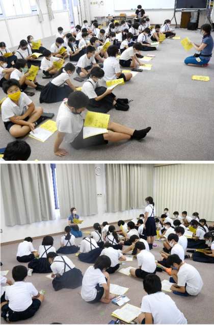 5年生が林間学習の行程などの説明をうけて聞いています。出来上がったしおりを見ながら聞いています。
