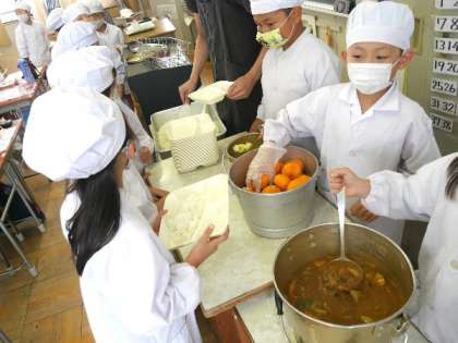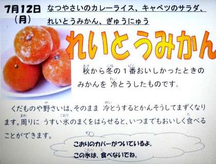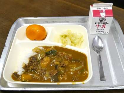 今日の献立は、夏野菜のカレーライス、キャベツのサラダ、冷凍みかん、牛乳でした。みんなの大好きなメニューでうれしそうです。
