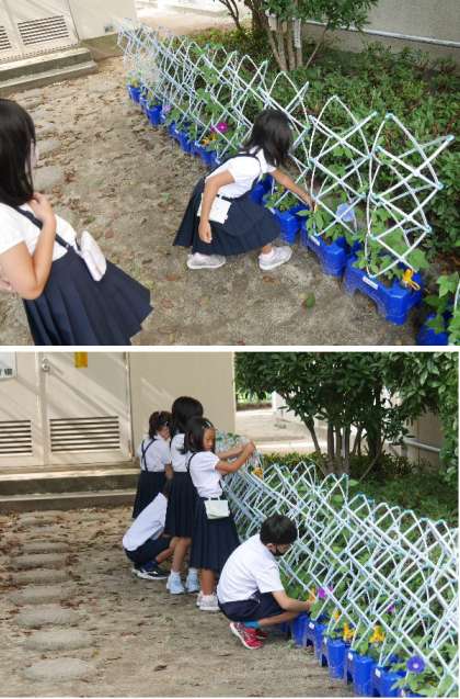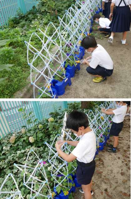 1年生が朝に登校したらすぐに水やりです。花も咲いて大きくなりました。今日からの懇談会でお家に持ち帰ってもらってお世話お願いいたします。来週から夏休みですね。