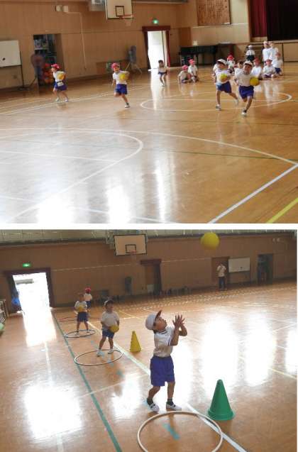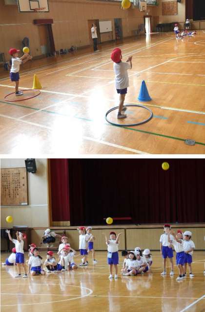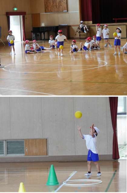 1年生が、体育館で、ボールをもって走ったり、投げたり、複雑な動きを練習していました。