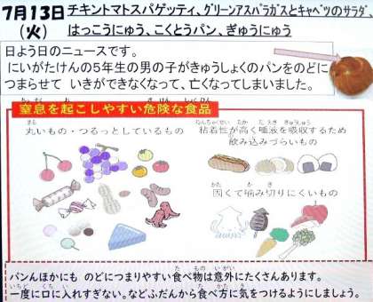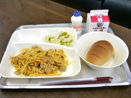 今日の献立は、チキントマトスパゲッティ、グリーンアスパラガスとキャベツのサラダ、発酵乳、黒糖パン、牛乳でした。