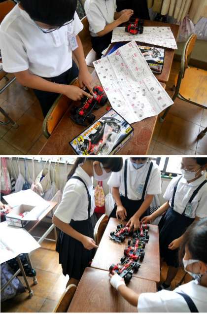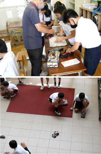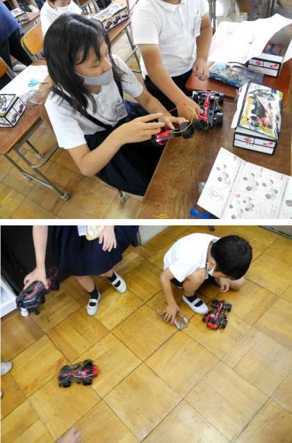 4年生では、電気の働きについて学習しています。モーターをつけて走るようにした車を完成させました。ちゃんと走るかためしています。