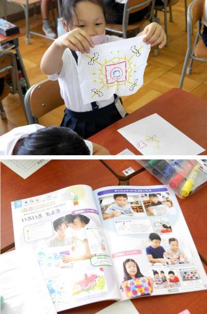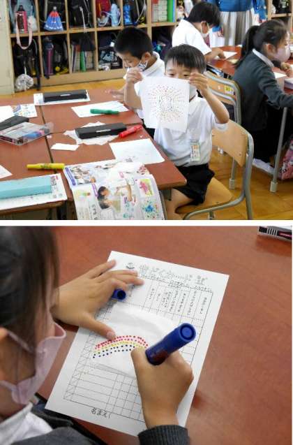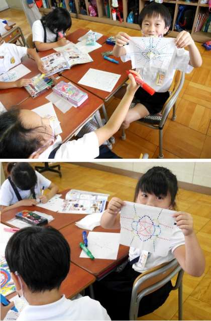 2年生が、ティッシュペーパーを折って、カラーペンで色をつけて広げると、きれいな模様が出来上がりました。きれいですね。
