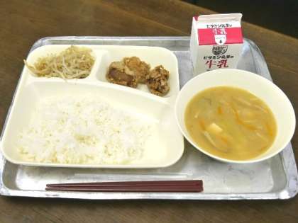 今日の献立は、豚肉の香味あげ、みそしる、もやしのおひたし、ごはん、牛乳でした。