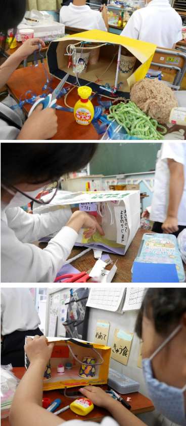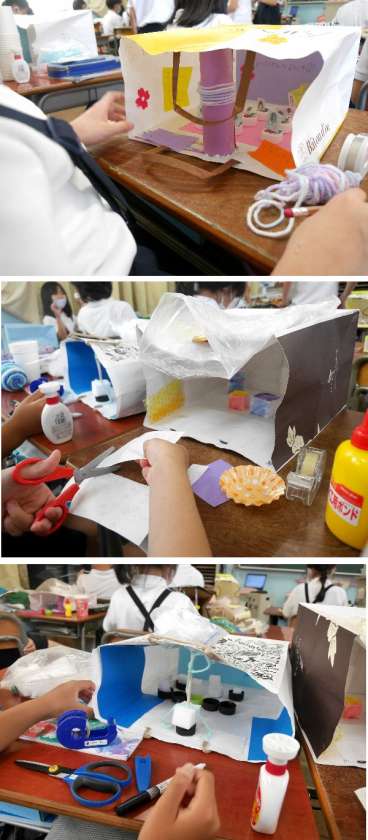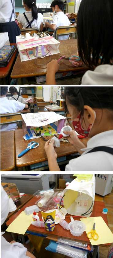 3年生の図工では、家からもちよった、紙袋の中に、イメージした世界を材料を使って作ってあらわします。いろんな、イメージの世界ができあがっていますね。