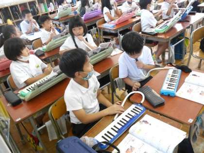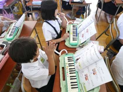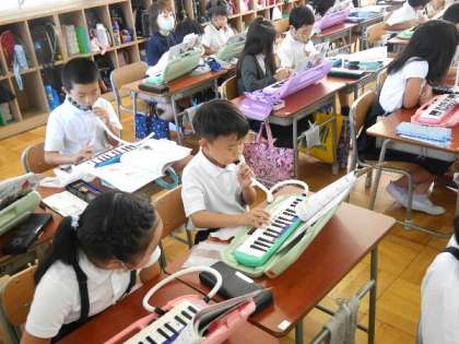 2年生が、鍵盤ハーモニカでドレミを練習です。「かっこう」を弾いています。うまく弾けたかな。ペアでお互いに聞きあいます。