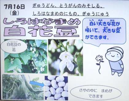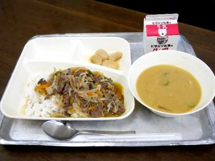 今日の献立は、牛丼、冬瓜のみそしる、しろはな豆の煮もの、牛乳でした。