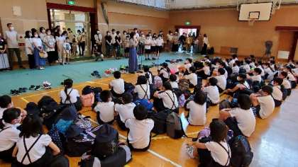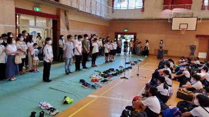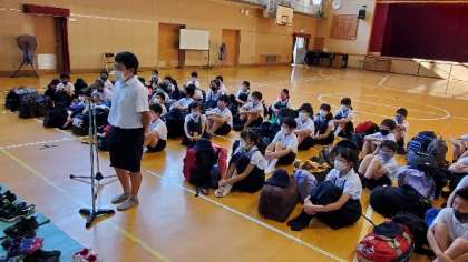 5年林間学習の始まりです。講堂で出発式を行いました。