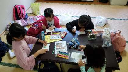 部屋でハガキを書いています。