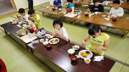 夕食の時間です。全員前をむいて、間隔をあけて食べます。