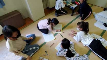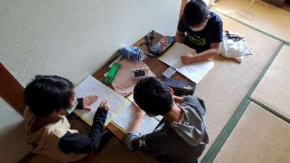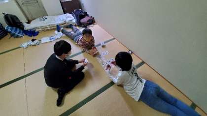 入浴タイムなので順に入浴する人もいます。各部屋では、しおりの思い出ページを書いています。カードゲームで楽しんでいる班もあります。
