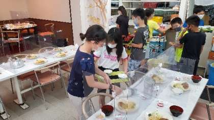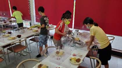 まもなく夕食です。食事係は配膳しています。手慣れたものです。