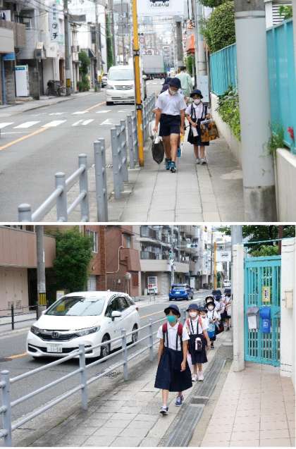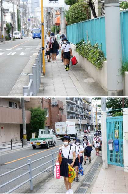 今日から2学期が始まります。児童たちが集団登校で登校してきました。