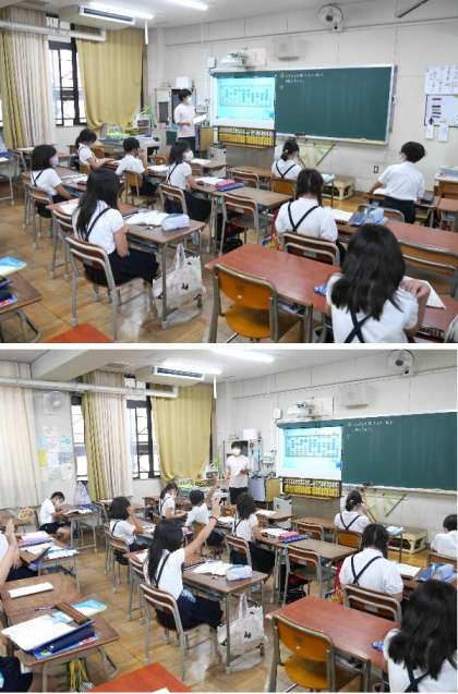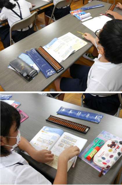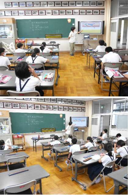 4年生の算数ではそろばんを学習しています。学級を半分の少人数にして、分かれて学習しています。