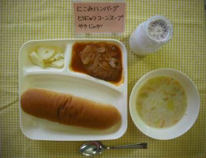 今日の献立は「煮こみハンバーグ、豆乳コーンスープ、焼きじゃが、コッペパン、いちごジャム、牛乳」です。
