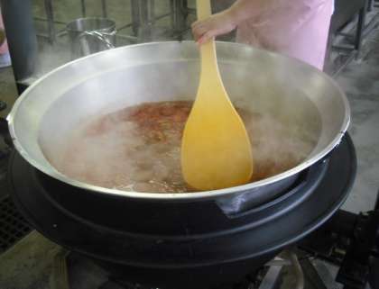 煮こみハンバーグは、炒めたたまねぎとケチャップ、ソースなどで作った煮汁でハンバーグをじっくり煮こみます。子どもたちに人気のメニューです。