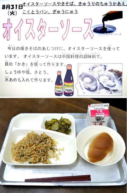 今日の献立は、オイスターソースやきそば、きゅうりの中華あえ、黒糖パン、牛乳でした。