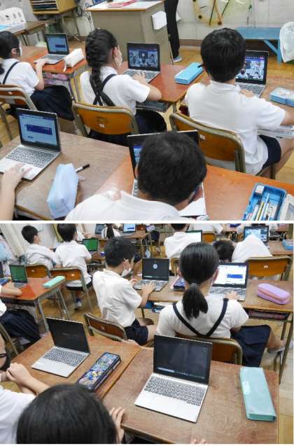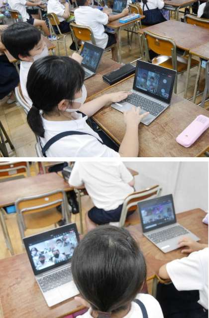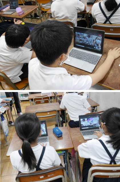 4年生が教室でオンライン接続の練習をしていました。操作もだいぶ上手になりました。スムーズに接続できます。