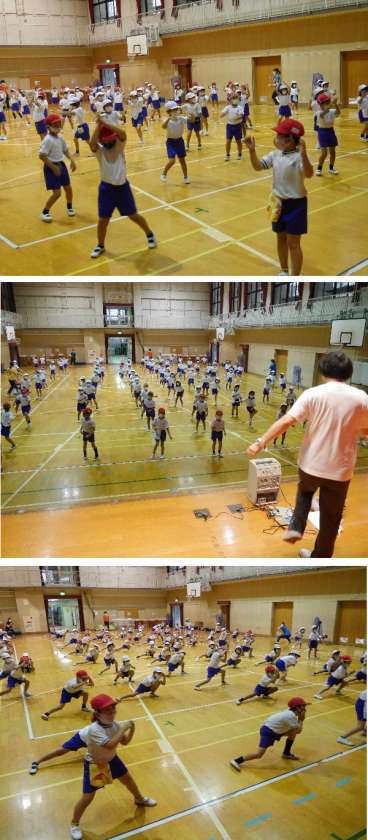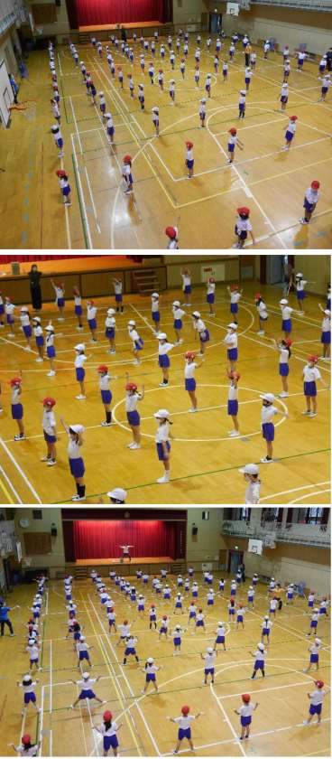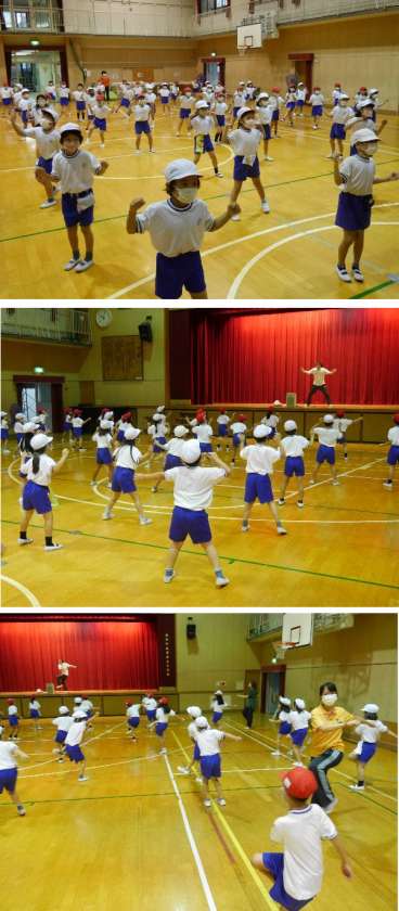 1年生の体育では、運動会での発表にむけて、簡単なダンスを練習しています。間隔をあけて音楽にあわせて楽しく踊ります。