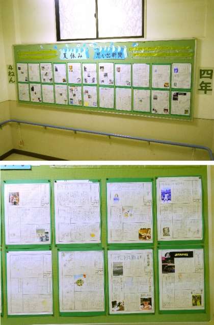 4年生の掲示板に、夏休みの思い出を書いた新聞が掲示されています。写真を上手に配置して作っていますね。
