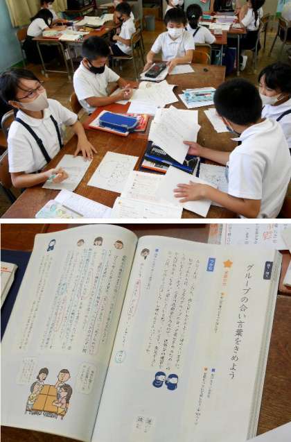 3年生の国語では、グループで司会の進行にそって話し合って、グループの合い言葉をきめています。話し合いによって、どのように進めていくのかを学習しています。