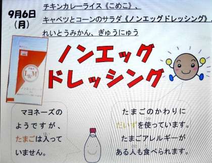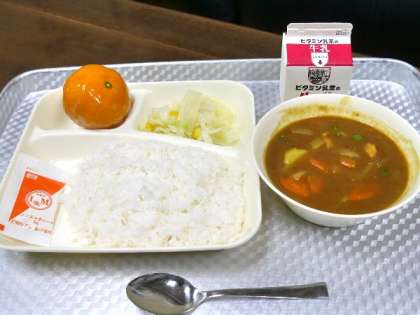 今日の献立は、チキンカレーライス、キャベツとコーンのサラダ(ノンエッグドレッシング)、冷凍みかん、牛乳でした。みんなの大好きなメニューですね。