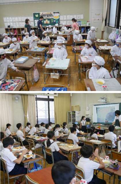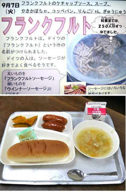 今日の献立は、フランクフルトのケチャップソース、スープ、焼きかぼちゃ、コッペパン、りんごジャム、牛乳でした。