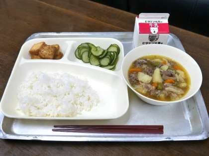 今日の献立は、にくじゃが、厚揚げのみそだれかけ、あっさりきゅうり、ごはん、牛乳でした。