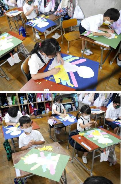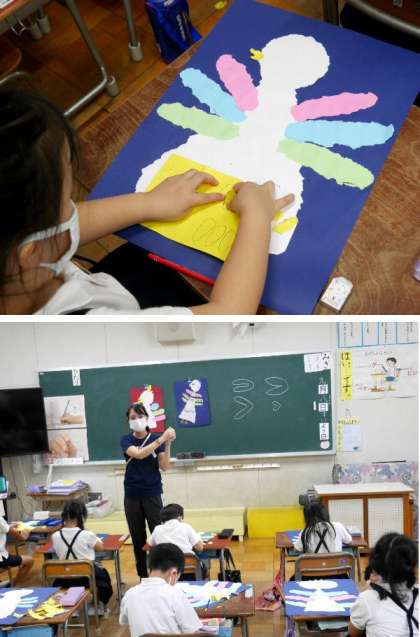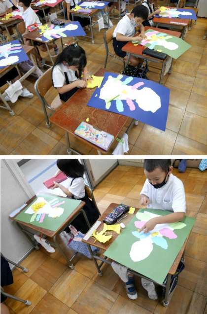 1年生ではちぎり絵でおしゃれなとりをつくっています。今日はくちばしを作ってはっています。おしゃれなくちばしになったかな。