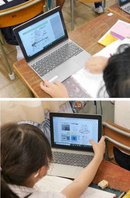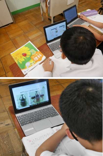 3年生が、パソコンでインターネットを使って昆虫について調べています。とてもくわしくわかりますね。