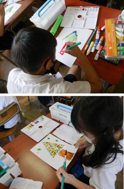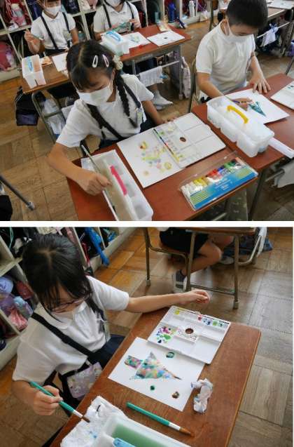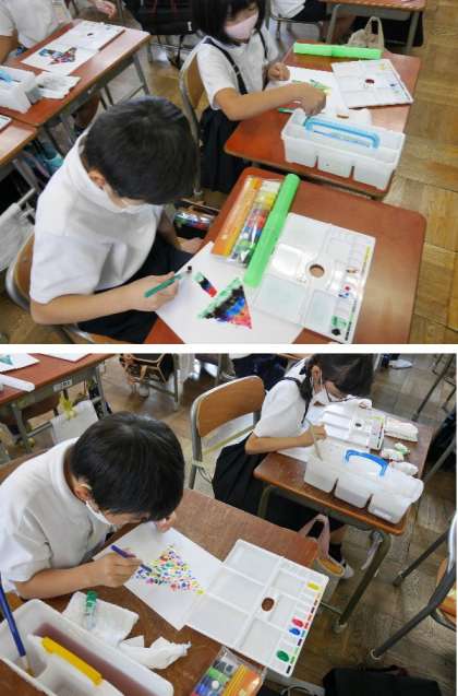 3年生が絵具を使って絵を描いています。木のわくの中を、カラフルな色でつけて、水をつけてにじましたりしています。いろいろな技法がありますね。