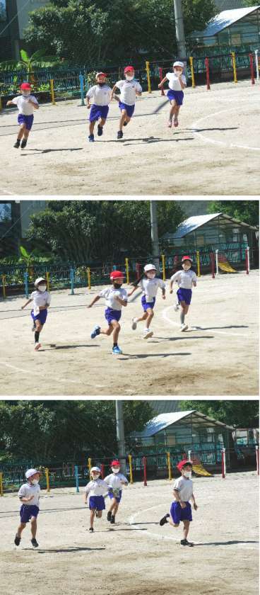 1年生では運動会の個人走の練習をしていました。「よーい」「どん」合図にあわせてスタートです。トラックを半周走ります。