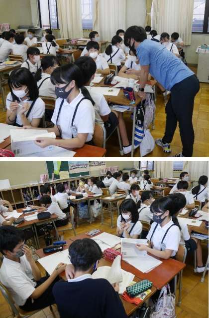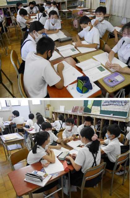 6年生の国語では、話し合って考えを深める学習をしています。話しての考えと自分の考えを比べたり、意図を明確にしながら計画的に話し合って深めていきます。「対面」と「オンライン」について話し合っている班もありました。メリットとデメリットを出し合って深めていました。