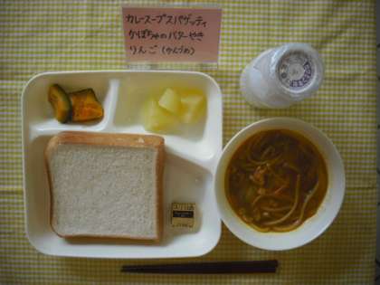 今日の献立は「カレースープスパゲッティ、かぼちゃのバター焼き、りんご(かんづめ)、食パン、バター、牛乳」です。スープスパゲッティなので、見た目は確かにカレーうどんのようですね。「おいしい」とほとんどのクラスが完食していました。 パンにつけるバターも好評でした。