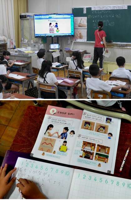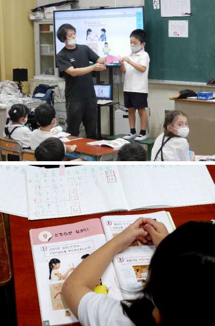 1年生の算数です。折り紙の縦と横、どちらが長いか調べましょう。どうやったらわかるかな。