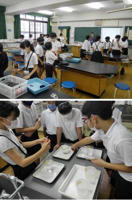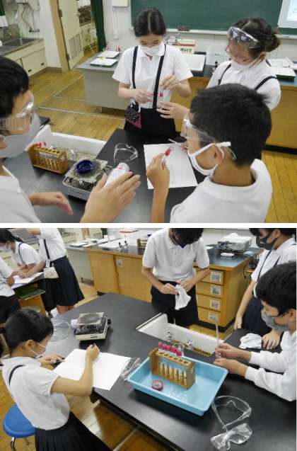 6年生が理科室で実験をしています。試験管にいろいろな水溶液をいれて、見た目やにおいの違いを調べました。