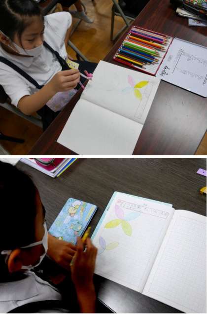 コンパスを使って、いろいろな図形を描いています。複雑な模様もかくことができますね。どうやったらかけるのか、コンパスの特徴を考えながら描いています。