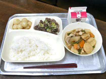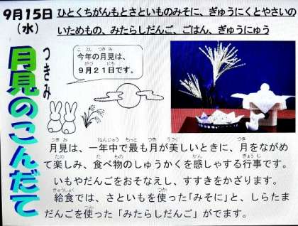 今日の献立は、一口がんもと里芋の味噌煮、牛肉と野菜の炒め物、みたらしだんご、ごはん、牛乳でした。もうすぐ月見なんですね。晴れるといいですね。
