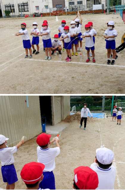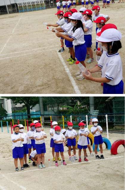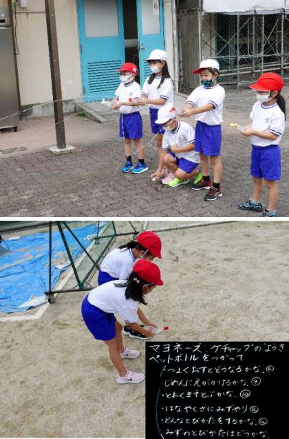 1年生が、マヨネーズやケチャップの容器、ペットボトルに水を入れて、運動場に集合しました。容器を強くおすとどうなるかな。水が遠くまでとばせるかな。どんなとび方をするのかな。いろいろな体験をして学習していきます。