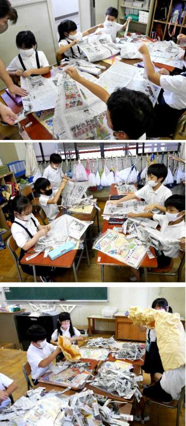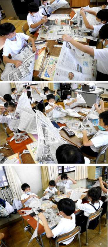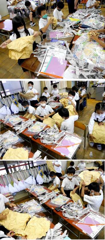 2年生が新聞を細かくさいています。クラフト紙の袋をくしゃくしゃにして、その中に新聞紙をまるめて入れて、いろいろなものを作ります。
