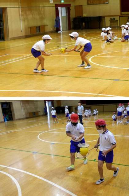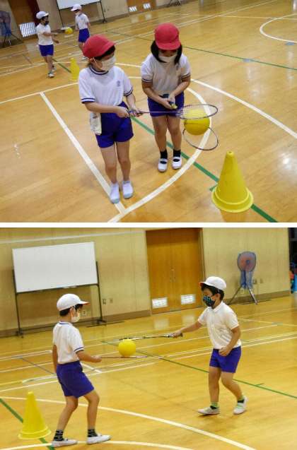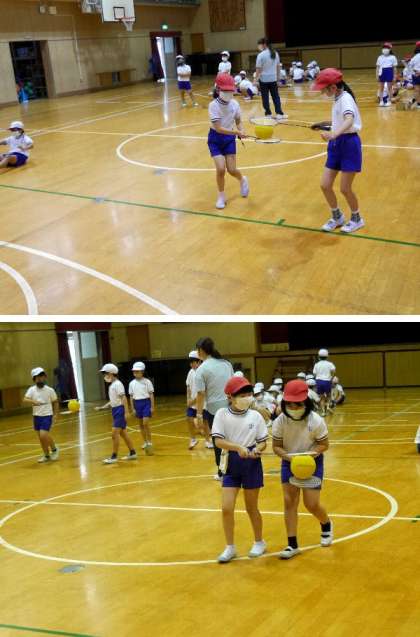 3年生は、運動会の団体競技で、ボールをラケットではさんで運びます。二人の呼吸があわないと、すぐに落ちてしまいます。全集中の呼吸でがんばっています。