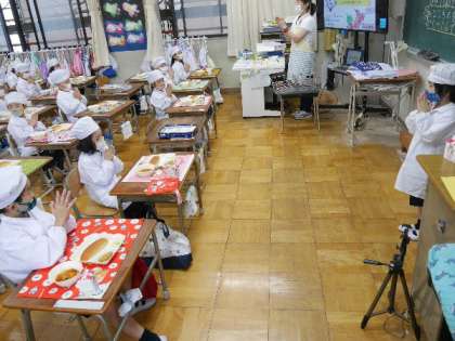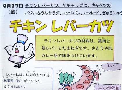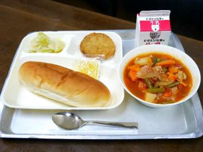 今日の献立は、チキンレバーカツ、ケチャップ煮、キャベツのバジル風味サラダ、コッペパン、マーマレード、牛乳でした。