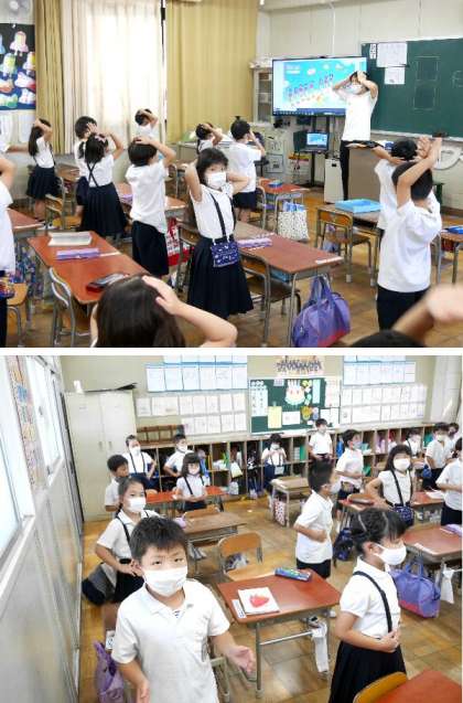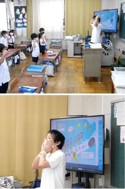 1年生が、「どれみのうた」を聞いて、どれみにあわせてからだをうごかしています。ダンスみたいで楽しいですね。