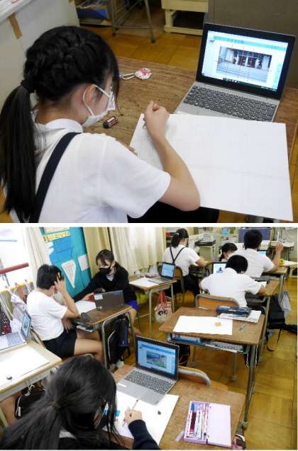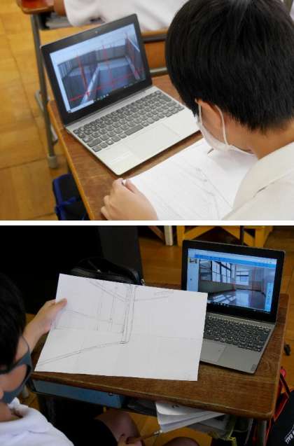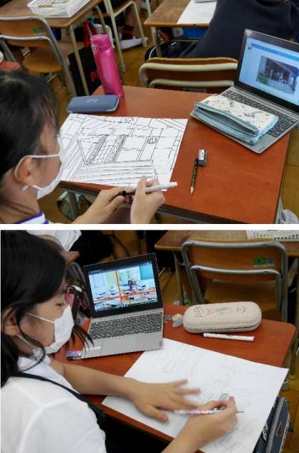 6年生の図工では、校舎内の気に入ったところの写真を撮ってきて、マス目をひいて、画用紙にスケッチして線画を描いています。とても緻密な作業です。