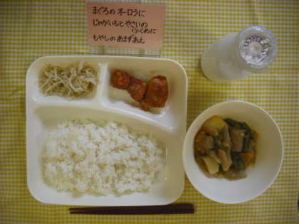 今日の献立は「まぐろのオーロラ煮、じゃがいもと野菜の含め煮、もやしの甘酢あえ、ごはん、牛乳」です。 まぐろのオーロラ煮は、から揚げにしたまぐろに、ケチャップと砂糖と赤みそを合わせたタレをからめています。みそを入れることで、甘すぎず旨みのある味に仕上がります。「初めて食べた味、おいしい」と言っていた1年生もいました。