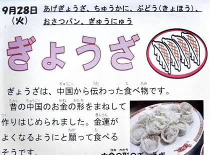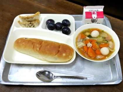今日の献立は、あげギョウザ、中華煮、ブドウ(巨峰)、おさつパン、牛乳でした。
