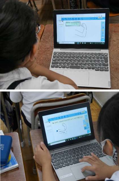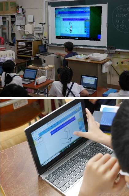 パソコンを使って、人間の腕の中の骨がどうなっているか書き入れて予想しています。