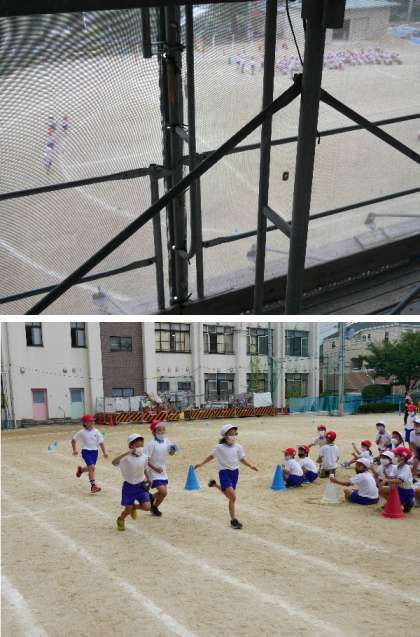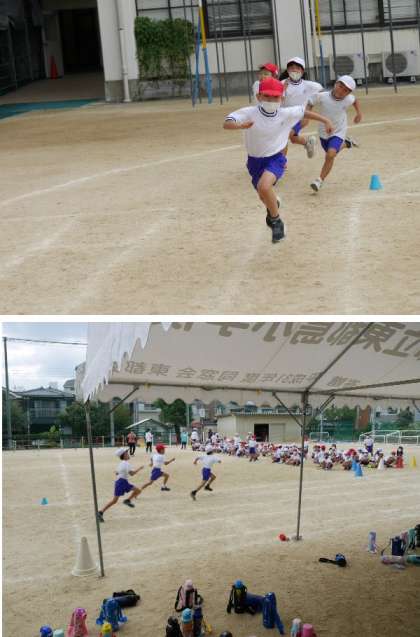 1年生が徒競走の練習をしています。だんだん早く走れるようになってきました。校舎からは外壁塗装工事であまりみることができません。