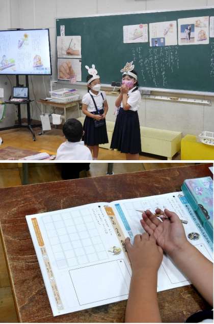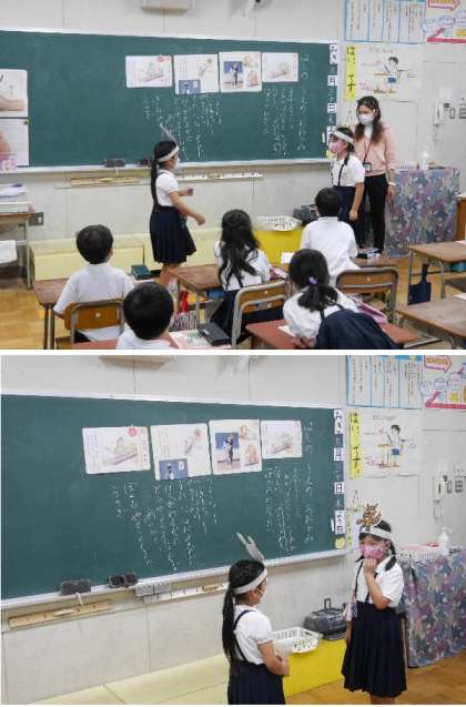 1年生の道徳では「橋の上の道徳」をおこなっていました。物語を実際に狼やウサギの面をつけて、役割をしながら考えてみました。