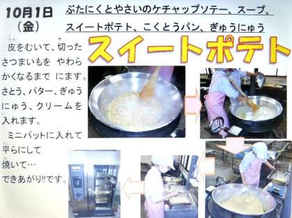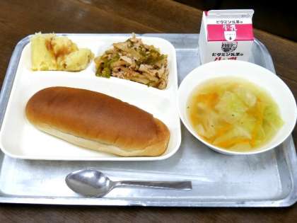 今日の献立は、豚肉と野菜のケチャップソテー、スープ、スイートポテト、黒糖パン、牛乳でした。